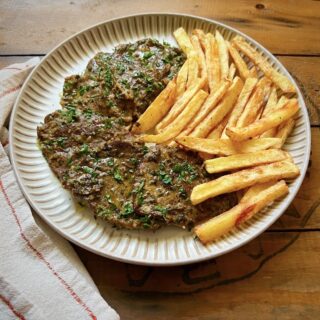 A traditional main course from the Greek island of Corfu that highlights veal/beef scallopini braised in a delicious wine, vinegar, garlic and parsley sauce.