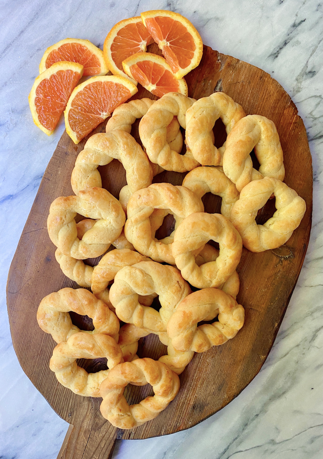 Preheat your oven to 350˚ F. Line two baking sheets with parchment paper. Remove the dough from the refrigerator and let it rest for five minutes. Pinch off a small piece of the dough and roll it into a small, walnut-sized ball. Roll it out with your fingers into a thin rope about 7-inches long. Form the rope into a circle and secure the ends. Alternatively, you can also twist the dough and then form little circles with it. Place on the baking sheet. Continue with the rest of the dough until you have formed all your cookies.