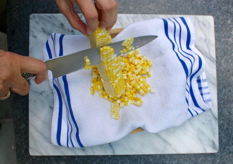 1. Gather all the ingredients. Place a clean kitchen towel over a medium bowl. With a sharp knife, remove the kernels from the cob. Reverse your knife and scrape any remaining pulp from the cob using the dull side of the knife (you should have about 1½ cups of kernels). Empty the kernels into the bowl.