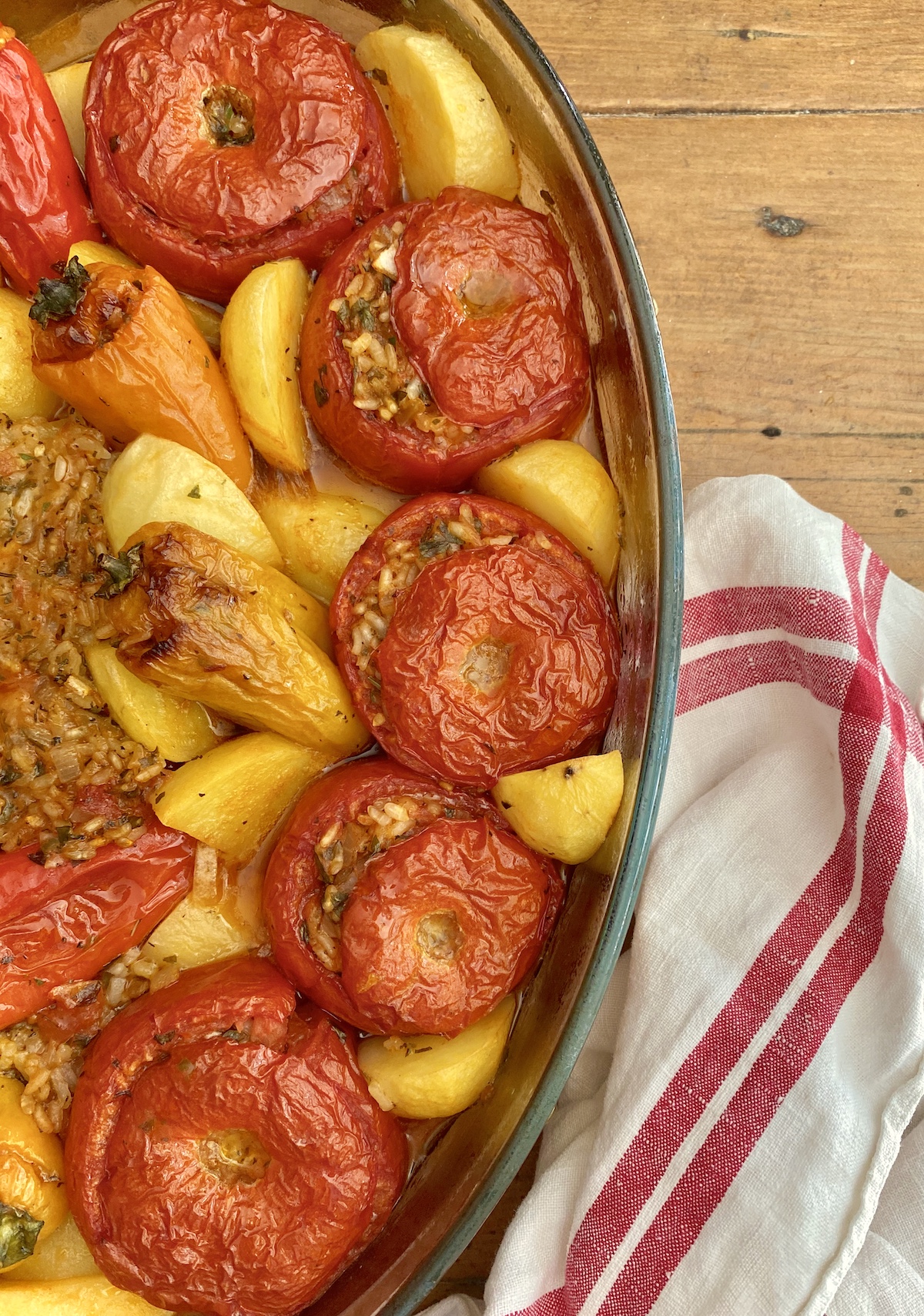 In Greece, bell peppers and zucchini are also stuffed alongside the tomatoes.  Small potato wedges are always part of the dish as well, and are added in between the stuffed vegetables. The flavor of the tomatoes intensifies as they roast and the rice cooks gently and absorbs all the delicious juices of the tomatoes themselves.